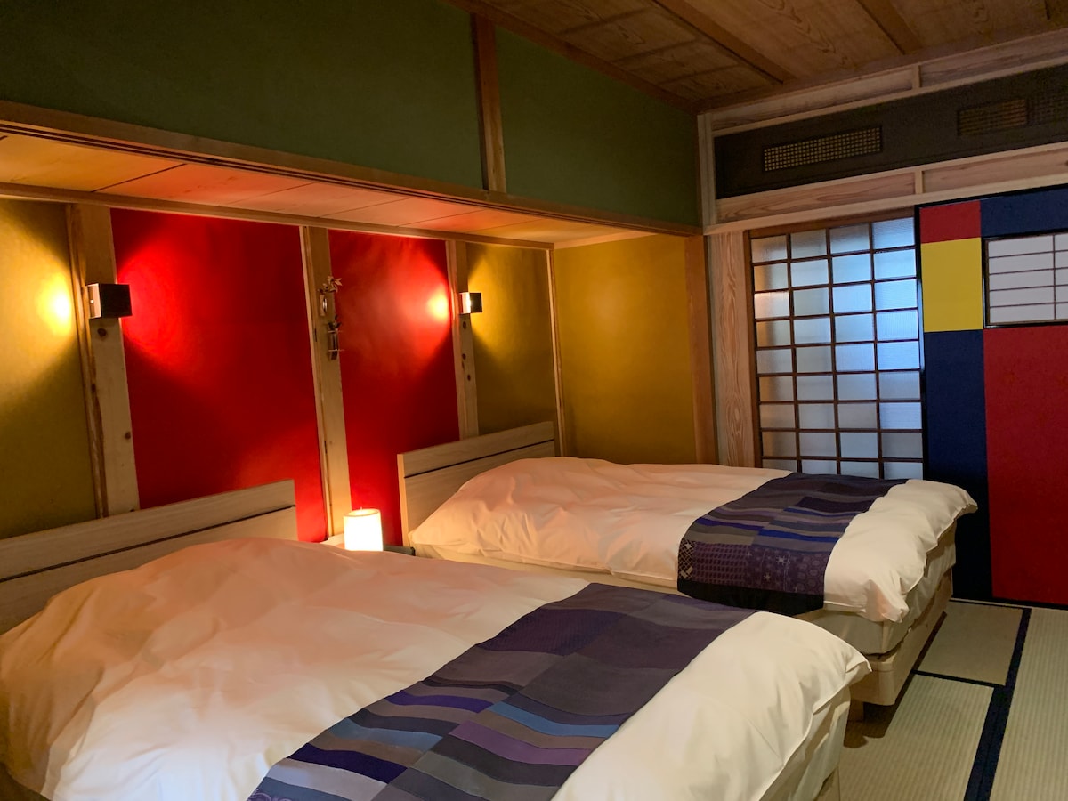 Þetta er rólegt tveggja hæða lítið raðhús í hjarta Gujo Hachiman. Aðeins fyrir 31. ♪♪desember♪♪ Þú getur sérstaklega útvegað hors d 'oeuvres og þrjú þrep.(+ 30.000 jen: greitt á staðnum) Shuyama er mjög hljóðlát og þú getur séð „Gujo Hachiman kastalann“ fljóta í gegnum gluggann á annarri hæð. Ég er einnig stolt af þægindum rúmsins.Sofðu í þægilegum heimilisfatnaði sem er búinn til í Japan með tvöfaldri grisju úr 100% bómull. Einnig er boðið upp á eldhúskrók.Morgunverður er retró-kaffihús í nágrenninu með ókeypis morgunþjónustu. Hverfið Shuyama er fullt af gamaldags bæjarhúsum og þú getur farið í rólega gönguferð um leið og þú fylgir hreinu flæði Ohime-árinnar, sem er uppspretta Omehime-fossanna. Þar að auki er Zen Zenji-hofið, sem er einnig samningsbundið bílastæði nálægt Zhouyama, þekkt fyrir hinn þekkta garð í Muromachi-stíl, „Tetsuen“. Máltíðir eru ekki innifaldar en við munum bóka „Ristorante Jaku no An“ við bókun.Við getum útvegað þér aðra ráðlagða matsölustaði á svæðinu en það fer eftir því hvað þú vilt.