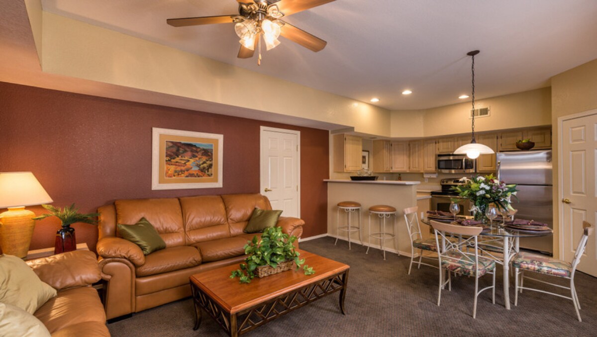 Bison Ranch býður upp á rúmgóðar tveggja svefnherbergja dvalarstaðssvítur sem rúma allt að sex gesti. Þú munt án efa kunna að meta friðhelgi aðskilinna svefnherbergja, hagkvæmni fullbúins eldhúss, þægindi þvottavélar/þurrkara og gasarinnar fyrir kuldalegar nætur. Auk þess eru stofa/borðstofa og sjónvarp í hverju svefnherbergi og grillgrill eru þægindi sem þú finnur ekki í venjulegu hótelherbergi. Slakaðu á, hallaðu þér aftur og njóttu útsýnisins frá einkasvölunum þínum í þessari paradís í Arizona!
