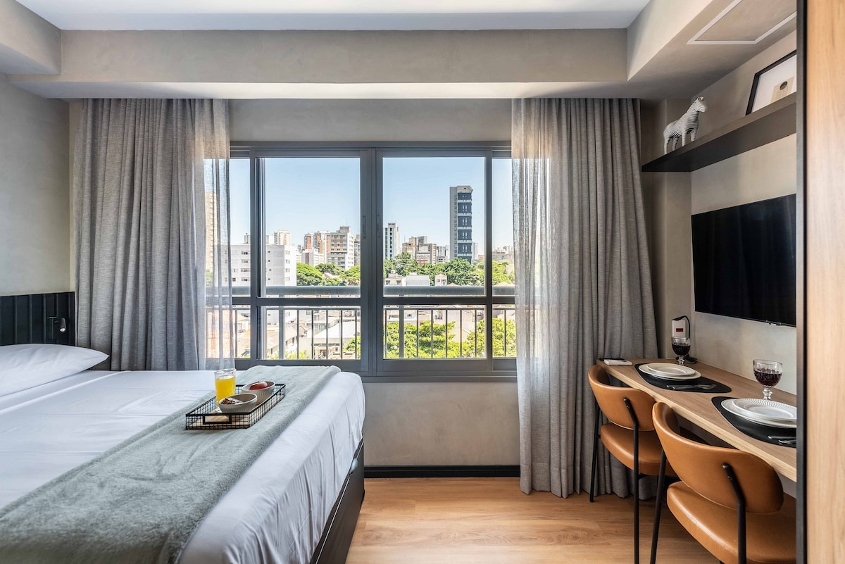 Stylish 50 m² apt. located at Bela Vista, has 24hr doorman. 2 bedrooms (only 1 with AC, and queen bed, the second one is quite small and can be used as an office, fitting a double-sized sofa-bed) and 1 bathroom. With amazing views from every window, it is a great place to work and relax. The private jet-tube at the balcony is a fantastic spot to enjoy the city views. Ideal for couples, professionals or small families looking for comfort, convenience, and one of the best views in the city.