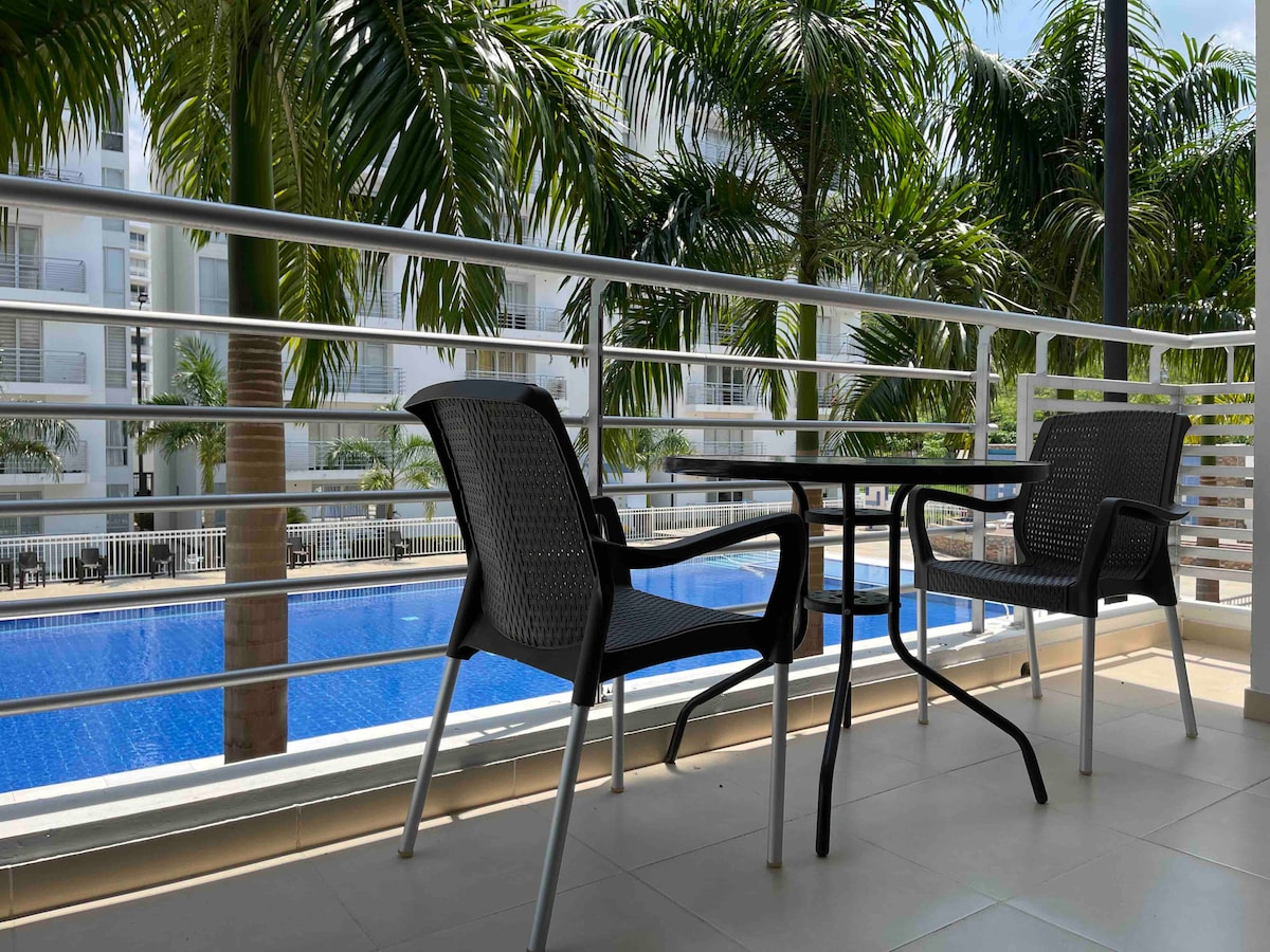 Lindo apartamento vacacional con acabados de lujo totalmente equipado, ideal para descanso en pareja o familia, dispone de tres cómodas habitaciones, balcón, aire acondicionado en habitación principal y zonas sociales (sala y comedor) con vista a la piscina y montaña, rodeado de vegetación y naturaleza. Excelente ubicación dentro de la ciudad de Girardot, a 1200 mts del estadio de fútbol , a 3 minutos en carro del nuevo Almacen Olimpica, supermercado D1 y Ara.