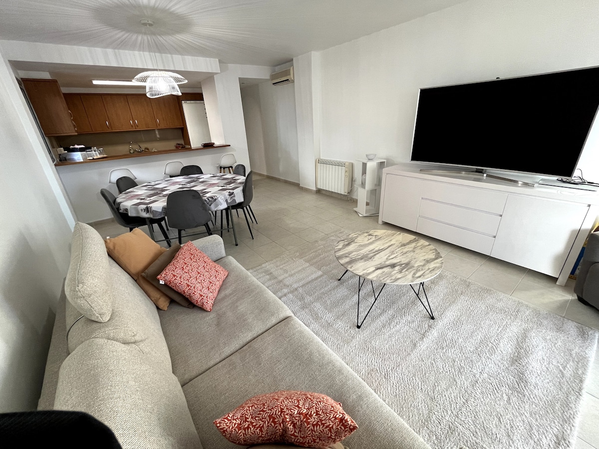 Heillandi íbúð í hverfi nálægt verslunum, veitingastöðum og ströndinni, í rólegu umhverfi 350 m frá ströndinni Hjónaherbergi með 160x200 rúmi, stofa með svefnsófa, borðstofuborð með 4 stólum, opið eldhús og baðherbergi. Njóttu svala og loftræstingar! Stórt ókeypis bílastæði fyrir framan húsnæðið 7 mínútna gangur á ströndina Ferðamannaskattur sem þarf að greiða við komu (1 evru á dag og á mann eldri en 12 ára 7 daga hámark)