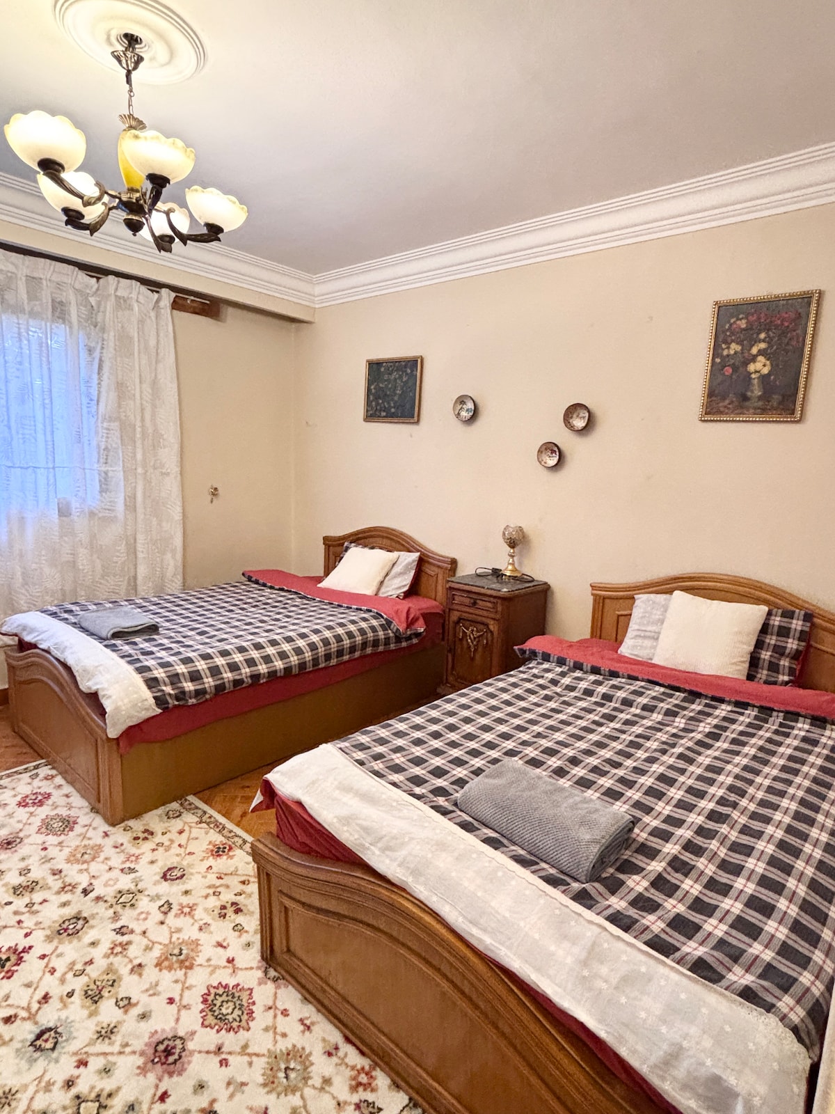 Þægilegt herbergi með tveimur aðskildum rúmum í íbúð í klassískum egypskum stíl í hjarta Kaíró. Herbergið er hluti af tveggja herbergja íbúð og gestir deila tveimur baðherbergjum, fullbúnu eldhúsi og rúmgóðri stofu. Staðurinn er rólegur og hentugur hvort sem þú ert í vinnu eða ferðamennsku og nálægt Egyptalandssafninu, Tahrir-torginu og sögulegum kaffihúsum og veitingastöðum fyrir ósvikna og þægilega dvöl í hjarta Kaíró.