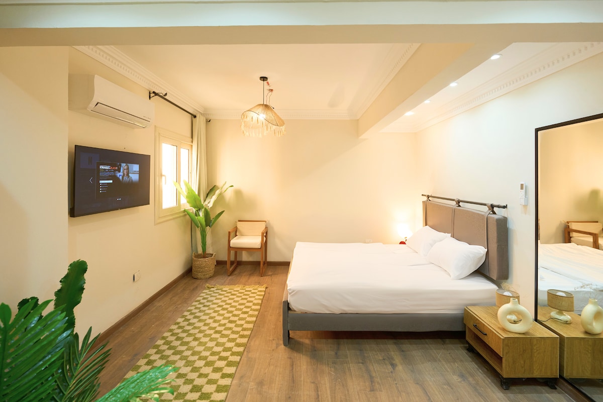 Gistu í stíl í fallegustu Airbnb-íbúðinni í Kaíró sem er staðsett í nýenduruppgerðum göngugötum hins sögulega miðbæjar Cairo - menningar-, fjárhags- og sprotafyrirtækjum Egyptaland. Þessi tveggja herbergja íbúð er með 4 metra háu lofti, endurnýjuðum arkitektúr og einstaklega vel gerðri blöndu af antík, gömlum og nýjum húsgögnum. Á henni eru 3 svalir, þægilegt eldhús og aukarúm.