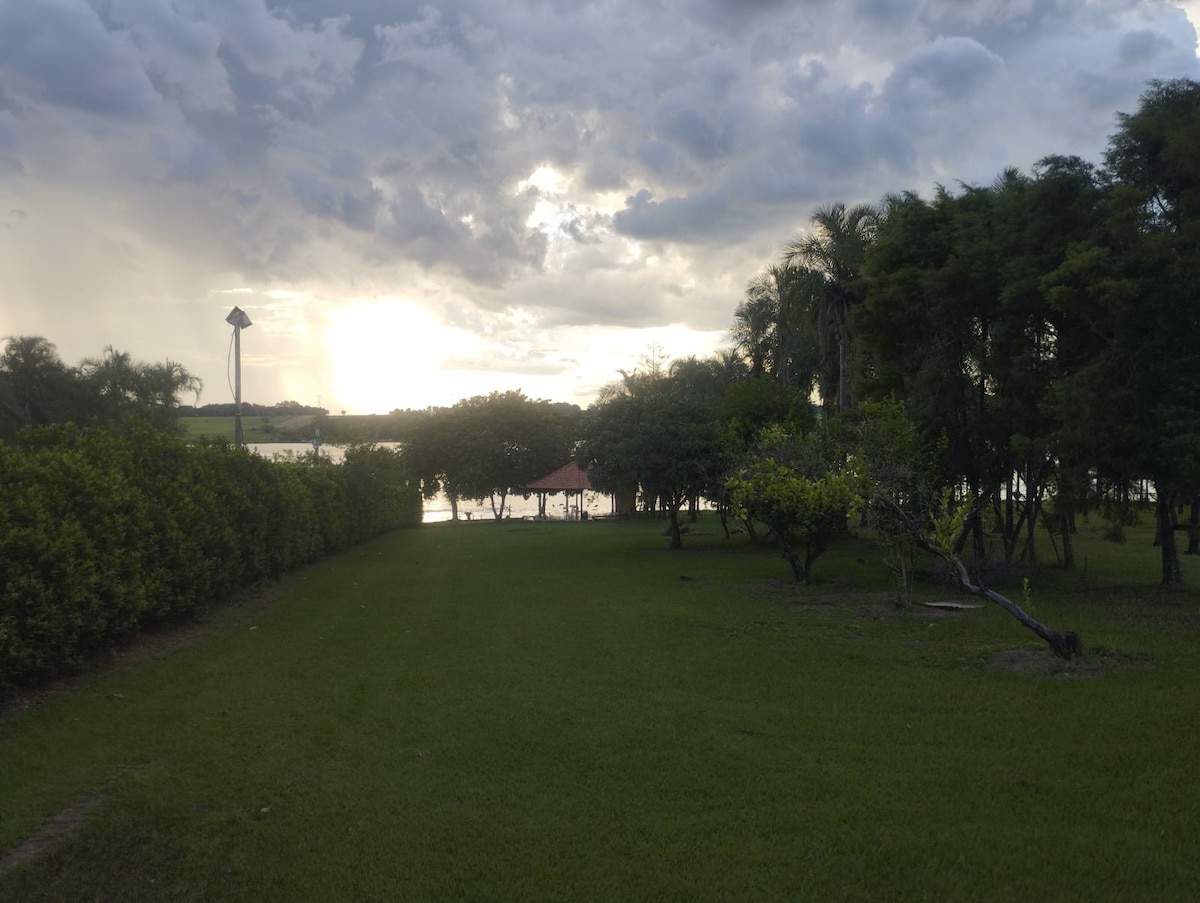 Distant 15 miles from Penápolis, picturesque city in the interior of SP (heading for S. J. of Rio Preto) with a privileged view, ideal for outdoor activities, sports, barbecues, fishing, rest and leisure. Perfect for couples, families or groups (and pets). The house is simple and cozy, has a very wide exterior balcony with barbecue and relaxing hammocks, and in the inner part the house has comfortable room with TV and air-conditioning, 4 bedrooms with air-conditioning, and 3 bathrooms.