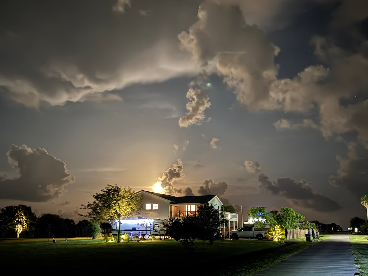 Upplifðu ógleymanlegt strandfrí á Blue Pearl í A&M, mögnuðu fjölskylduheimili steinsnar frá sandströndum. Njóttu ljúffengra grillmatreiðslna, náðu þér í leik yfir köldum drykk sem situr á einkabarnum eða njóttu magnaðra sólarupprása og sólseturs frá veröndunum. Með 3 rúmgóðum svefnherbergjum, fullbúnu eldhúsi og nægum aukahlutum eins og hleðslutæki fyrir rafbíl, einkaveiðibryggju og bátaramp er pláss fyrir alla fjölskylduna. Búðu til varanlegar minningar í Galveston með okkur og lærðu meira hér að neðan!