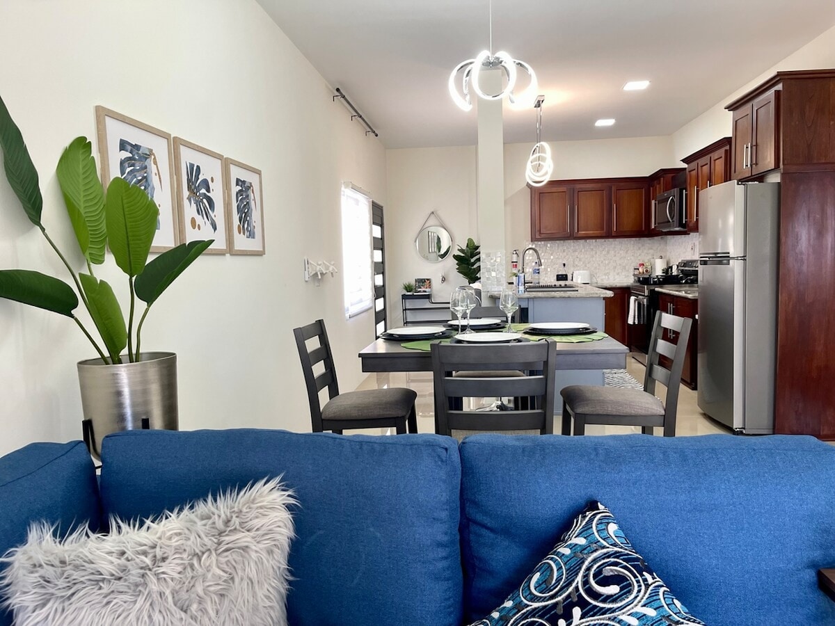 Kali 'na er staðsett í öruggu og afgirtu samfélagi og var stofnað til að vera heimili að heiman. Glæsilega þriggja svefnherbergja íbúðin okkar er frábær fyrir fjölskyldur eða litla hópa sem vilja nútímalegt frí. Slakaðu á í rúmgóðu stofunni/borðstofunni/eldhúsinu okkar sem er með þægilegum sætum og öllum nauðsynlegum eldhústækjum. Njóttu 65 tommu snjallsjónvarpsins okkar og hraðvirka þráðlausa netsins sem tryggir samtímis tengingu í nokkrum tækjum. Njóttu skyggðrar verönd með stöðugri, svalri karabískri golu. 2 sameiginlegar sundlaugar og leikvöllur.