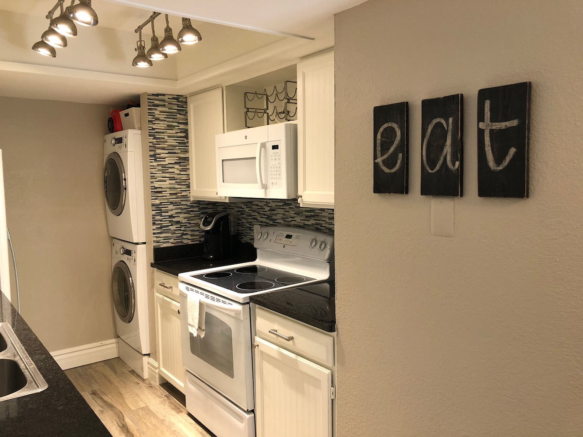 Njóttu dvalarinnar í þessu einkahúsnæði með 1 svefnherbergi! Nútímaleg húsgögn alls staðar. • 1 rúm af king-stærð með sérbaðherbergi og sturtu • 50" og 58" Roku Smart HD sjónvörp • Háhraða þráðlaust net • Fullbúið eldhús með ísskáp, frysti, örbylgjuofni, eldavél, ofni, brauðrist, Keurig-kaffivél, heitavatnskatli, síuðu vatni og uppþvottavél • Staflanleg þvottavél og þurrkari • Queen Murphy Bed • Bílastæði í bílskúr eða innkeyrslu • Lítið, notalegt einkiverönd • Engin gæludýr