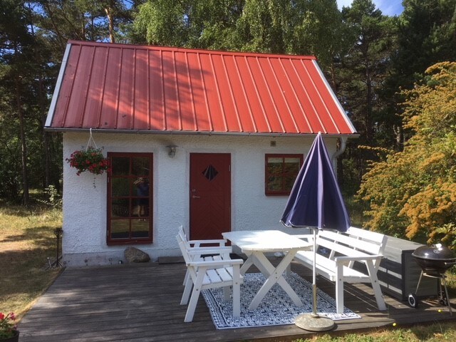 Kofinn er 30 fermetrar að stærð og með svefnlofti (ég tel það ekki hentugt fyrir börn yngri en 7 ára) þar sem stigið er mjög bratt. Þar er 1 rúm og 1 dýna. Sturtusvæðið er lítið en það uppfyllir þó hlutverk sitt vel. En þú getur líka farið í sturtu í nýja sturtunni sem er í ómálaða skúrnum og þar er líka hárblásari! Stór bakgarður með pláss fyrir afþreyingu. Bílastæði við hliðina á kofanum við veröndina hægra megin. Verslun og veitingastaðir eru í Lärbro, um 4 km fjarlægð.