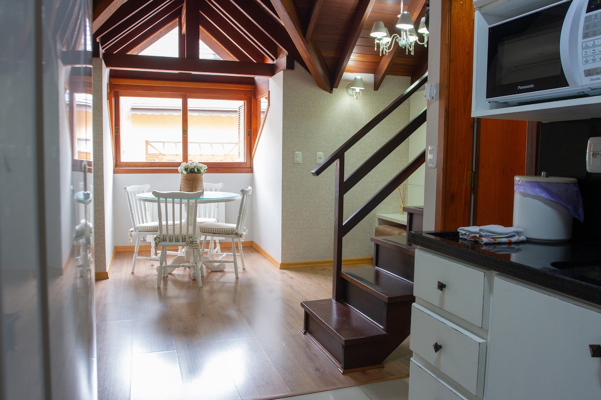 Charmoso duplex apartment in Gramado for up to 6 people, in one of the most met neighborhood of the city, the BLACK LAKE. Eignin er aðeins 400 metrum frá Lago Negro, stærsta ferðamannastaðnum í Gramado. Íbúðin er á 2 hæðum: Á 1. hæð, 1 stofu, 1 borðstofu, 1 svefnherbergi með hjónarúmi og fataskáp, American Coz og Social WC Á 2. hæð er fullbúin svíta í serrano-stíl með lækkuðu og hallandi lofti. Engu að síður er íbúðin fullbúin sem hús.