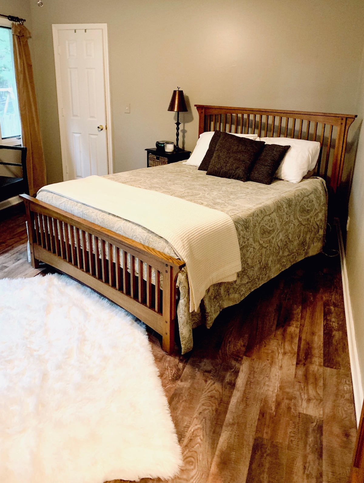This light and bright newer lower level suite is almost 900 square feet with an open floor plan. Rooms include a living/dining/kitchenette area, private bedroom, and bathroom. All very crisp, clean, and modern. A separate parking area will lead you down steps to a private patio adorned with seating for a place to relax and enjoy the rolling hill backyard and woods. The suite is stocked with several amenities to make your stay comfortable, including a welcome bottle of local wine and goodies.