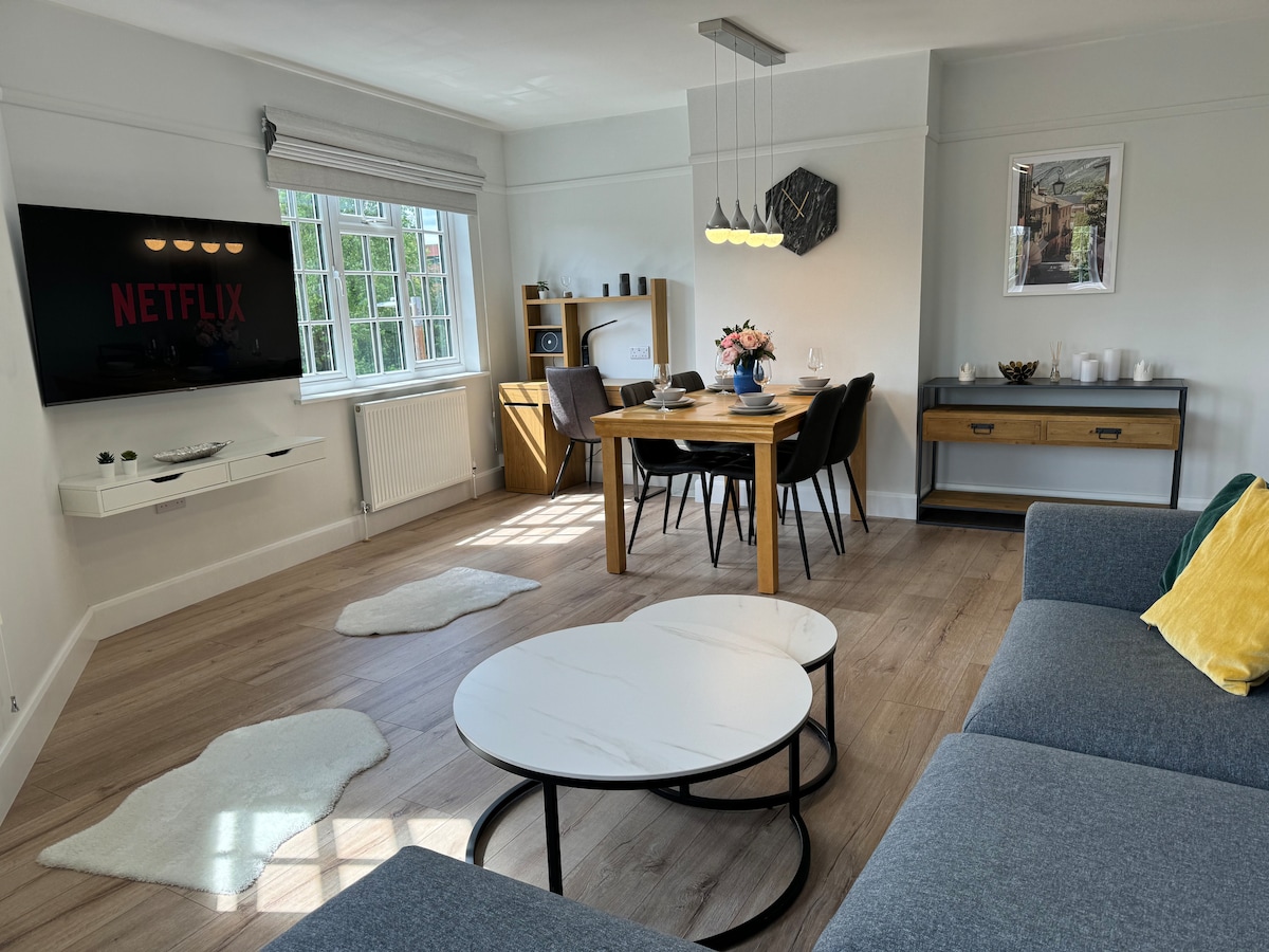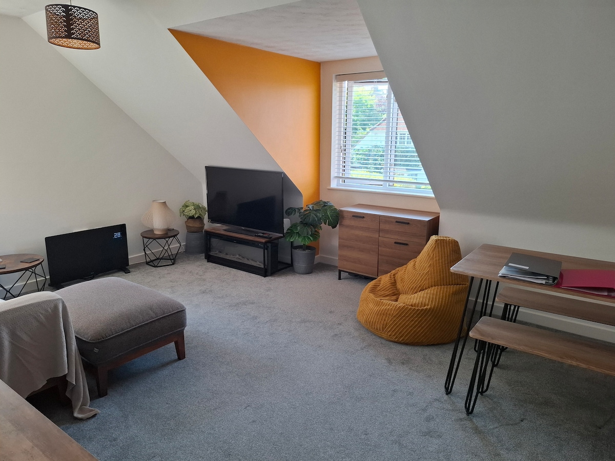 Charming & immaculate 1st-floor apartment with home comforts, fast fibre WiFi & free local parking. Located in the heart of the historic town of Buckingham & enjoying views over Chantry Chapel, Buckingham's oldest building. Shops, coffee shops, restaurants, riverside walks all on the doorstep. A short walk to Buckingham University & a short drive to Stowe School & Gardens & Silverstone, home to F1. Also close to, Bicester Village, Milton Keynes, Northampton, M1 & M40. Excellent reviews.