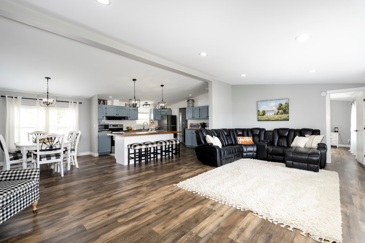 Nútímalegt býli sem býr í þessu 3 svefnherbergja nýuppgerða bóndabæ beint við milliveginn. Á þessu heimili eru 3 svefnherbergi, 2 baðherbergi, stofa, fjölskylduherbergi og borðstofa í eldhúsinu ásamt þvottavél og þurrkara. Allt frá nýjum tækjum til að hlusta á lag á meðan þú ferð í sturtu með bláa tönn hæfileikahátalarann á hjónabaðherberginu. Á þessu heimili eru í dagseiginleikum og kyrrð sveitalífsins. Sittu á bakþilfarinu eða forstofunni til að fá te og sötra yfir dádýr.