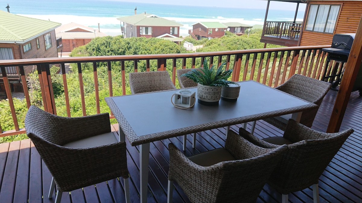 Þessi íbúð er tilvalin fyrir par með börn eða jafnvel 2 pör. Þú getur meira að segja komið að heiman á skrifborði með sjávarútsýni. Þú hefur einn aðgang að efstu hæðinni sem er með eigin verönd með gas braai, eldhúskrók og baðherbergi. Þú munt hafa frábært útsýni yfir hafið og Mosselbay benda frá nánast hvar sem er í íbúðinni. Húsið er staðsett hop sleppa og hoppa í burtu frá ströndinni þar sem þú getur gengið fyrir langa teygjur á enda eða tekið dýfu í sjónum.