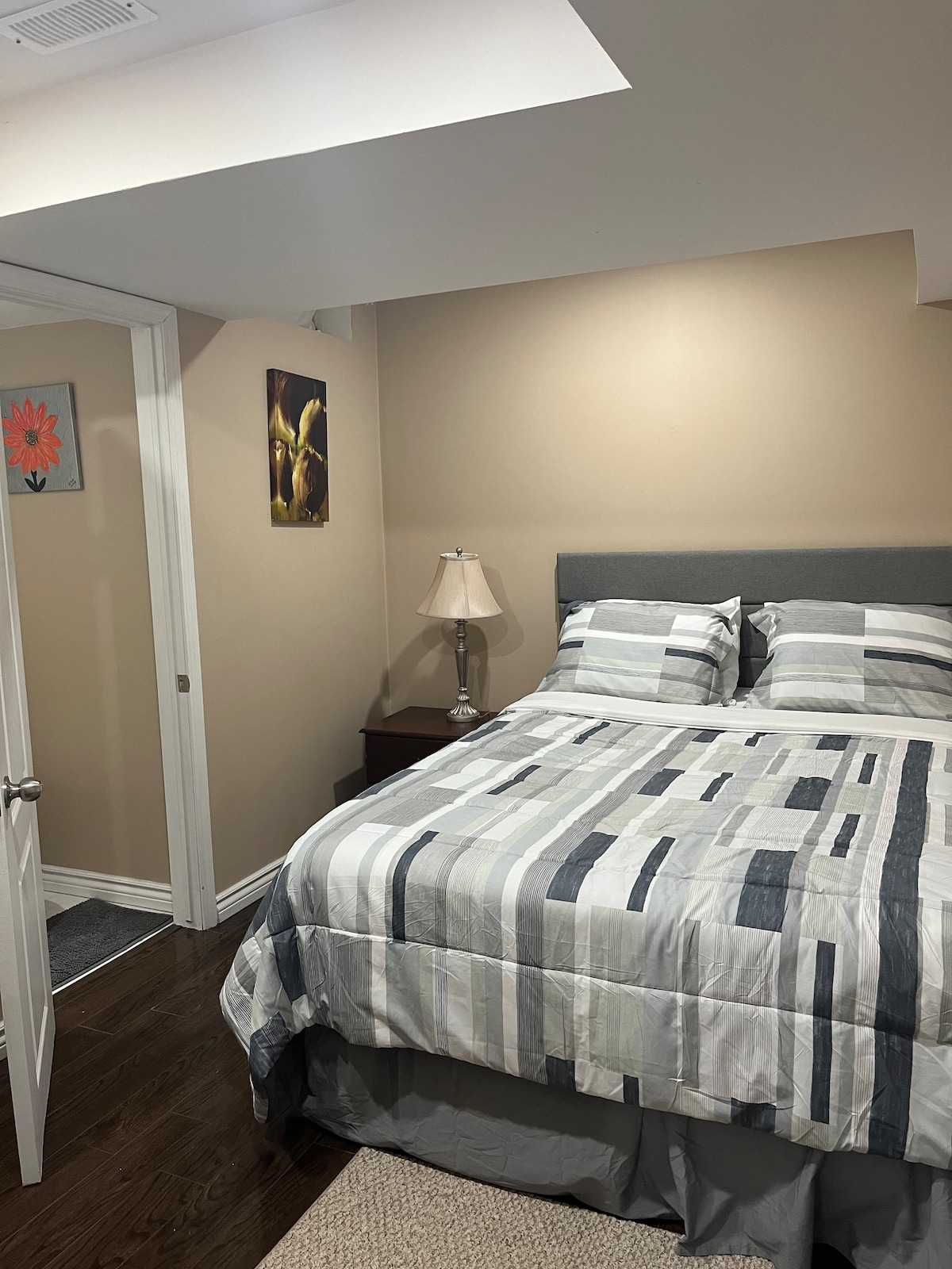 Welcome to New Toronto! Driveway parking included next to entrance. Large -Cozy basement apartment in lakeshore village, Lake Ontario is at the end of the street. Beautiful skyline view of downtown Toronto , Full kitchen with stove and oven. Large dining room table. Comfortable L- shaped couch. One bedroom with queen size bed. Washer , dryer, laundry facility. WiFi Netflix, Prime video, Book a month or longer stays , bring your pet.