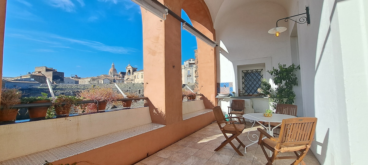 Enjoy unique views of Ursino Castle, Etna volcano, cathedral dome and sea from the panoramic terrace of my trendy loft apartment. The curated interior ambience is light, bright and features a mezzanine bedroom overlooking the living area. Just 150mt far from the typical and colourful fish market, 300mt from the Duomo square and 2km from the beach.