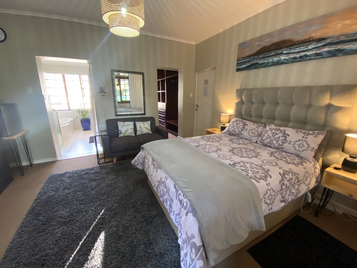 Our secure garden cottage has it's own entrance, with use of swimming pool and braai facilities. The space is newly renovated, with Egyptian cotton bedding, a kitchenette with refrigerator, microwave and kettle. Tea, coffee, milk and bottled water are provided. Spacious shower in the bathroom. Uncapped wifi, a desk for work, and Netflix and Showmax available. Enjoy sundowners on our deck overlooking the pool. You also have your own private outdoor seating area perfect for alfresco meals.