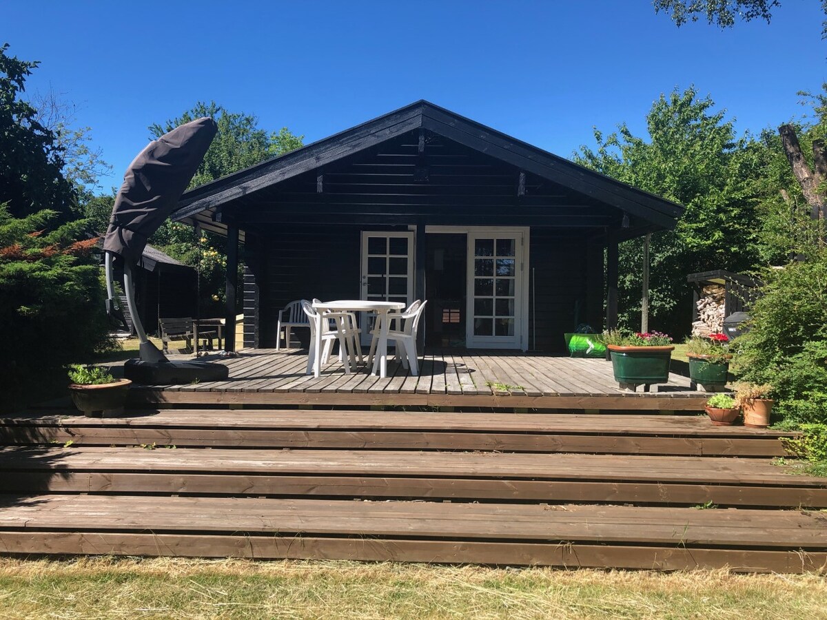 Stilfuld 25 m2 bjælkehytte. Egen lukket gårdhave med fliser og græsplane. Hytten er forsynet med klimaanlæg, lækkert køkkenafsnit med hvidevarer, samt bad og toilet. Parkeringsplads tæt på hytten. boligen og gårdhaven er afskærmet fra hovedhuset med egen indgang. Hytten er forsynet med sovesofa, “IKKE EN SENG”, med top madras 140 x 210. Den er beregnet til 2 voksne. Der er plissesolgardiner overalt, ikke mørklægningsgardiner. Mulighed for opladning af el-bil. Overdækket cykelparkering.