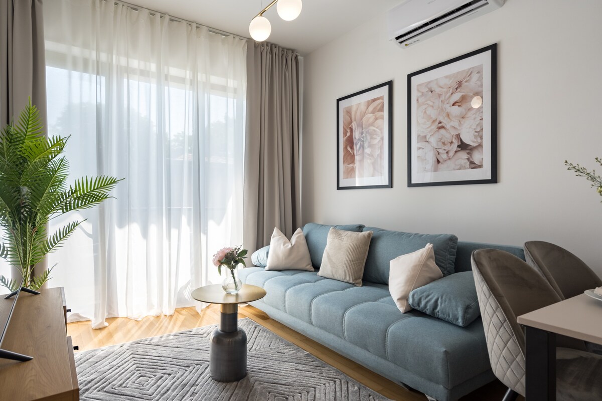 Verið velkomin í Mido Lumo, stílhreina og rúmgóða íbúð sem er hönnuð fyrir snurðulausa dvöl. Þetta nútímalega afdrep er fullkomið fyrir fjölskyldur, vini eða viðskiptaferðamenn með tveimur svefnherbergjum og tveimur baðherbergjum. Njóttu fullbúins eldhúss, notalegrar stofu og háhraða þráðlauss nets. Þægileg sjálfsinnritun í gegnum örugga móttöku með eftirliti allan sólarhringinn. Í samstæðunni eru 2 veitingastaðir á staðnum og LIDL og Mega Image eru steinsnar í burtu sem auðveldar daglegar nauðsynjar og veitingastaði.