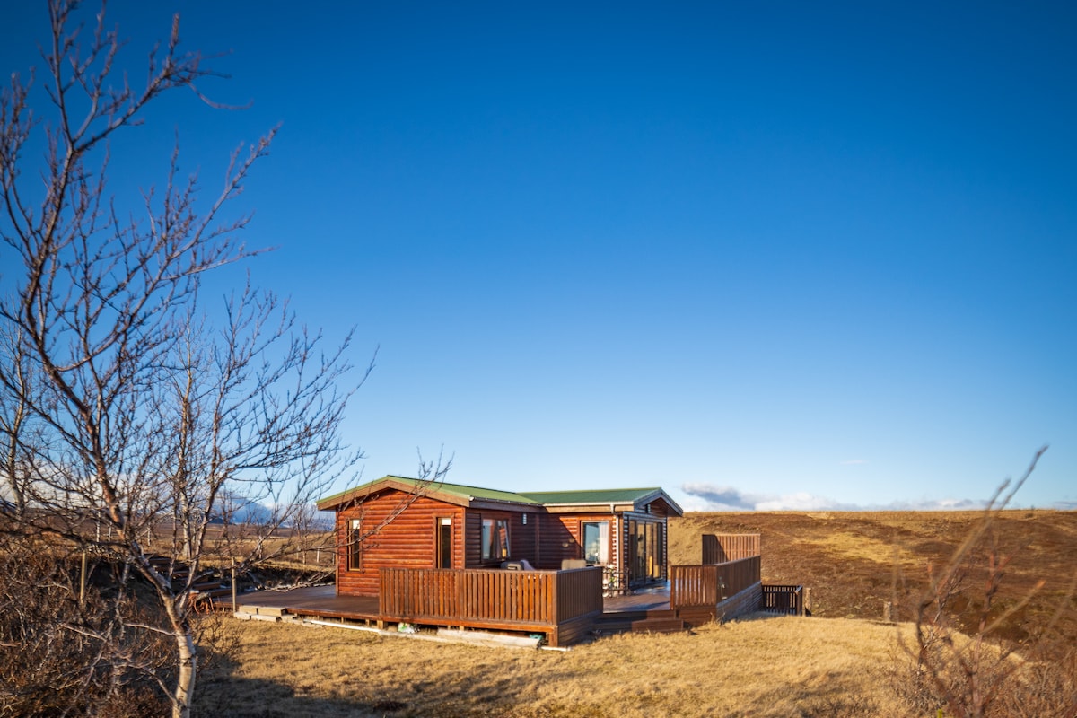 Eignin er nútímaleg 2ja herbergja, 2 baðherbergi sem eru eingöngu hönnuð af íslenskum arkitektum. Húsið er 93 m2, með fullbúnu eldhúsi og einkaverönd með fjallaútsýni og einka heitum potti. Það felur í sér ókeypis WiFI, sjónvarp, gólfhita, auk þvottavél og þurrkara. Það er fullkomlega staðsett í hinum vel þekkta Gullna hring, Geysi, Gullfossi og þjóðgarðinum á Þingvöllum og er aðeins 2 km frá hinu fræga kennileiti Kerið.