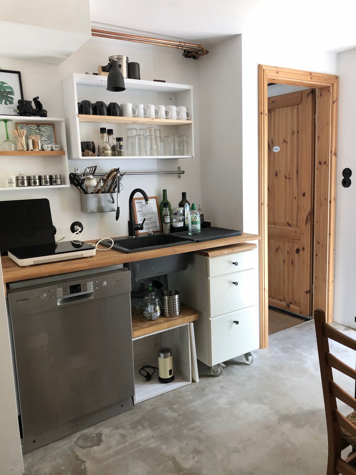 Þessi frábæri staður er allt annað en vanalega. Unnið með mikilli ást með sjálfbærri hugsun. Innréttingar trjáhússins, eldhússins og baðherbergisins samanstanda af munum sem hafa fengið annað líf. UPCYCLING in style :-) Hvort sem um er að ræða Hamborg, Norðursjó eða Eystrasalt er auðvelt að komast að öllu. Náttúra og skoðunarferðir í kringum okkur eru mjög sérstakar. Hér er eldhús og tvö baðherbergi. Þau eru staðsett í aðalhúsinu.