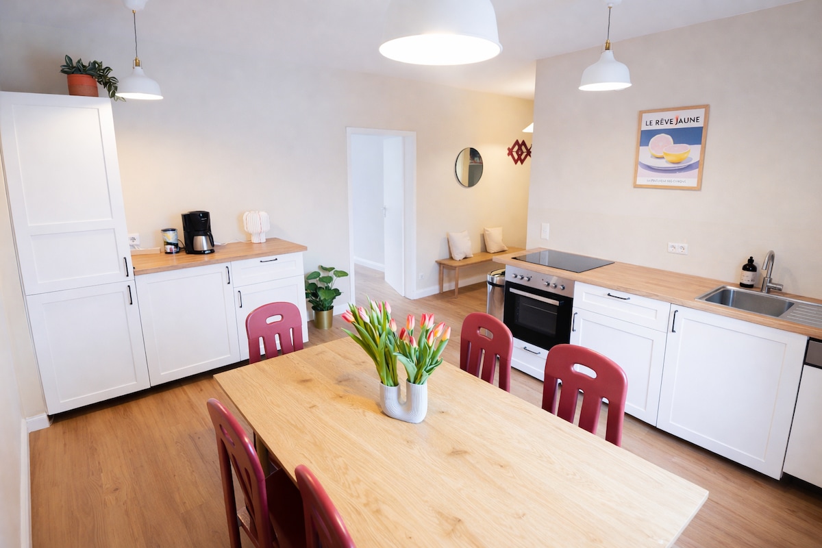 Þessi sögulega bygging er dæmigert norður-þýskt bóndabýli og stendur við jaðar lítils þorps með óhindruðu útsýni yfir sveitina. Á eigin engi bak við húsið liggur við 2 ha stóra náttúrulega lóðina okkar, með mörgum notalegum stöðum undir trjám og við strauminn. Við höfum endurnýjað búrið með náttúrulegum efnum og þægilegum búnaði, t.d. með arni og lítilli sauna.
