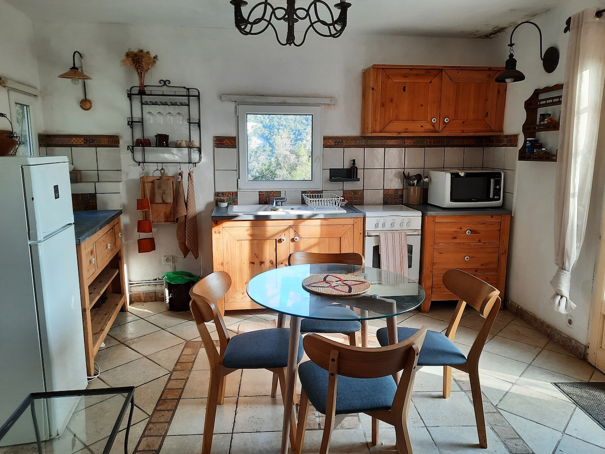 Lítill lykill, endurnýjaður sem bústaður, með útsýni yfir Mas, týndur neðst í Cevennes-fjallinu milli eikartrjáa og kastaníutrjáa. Þú getur notið 21,5m² (eldhús, stofuna svefnherbergi og baðherbergi). La Cléde er með tvær samliggjandi einkaverandir. Við bjóðum upp á nokkrar verandir, þar á meðal eina við lækinn með náttúrulegri sundlaug þar sem hægt er að kæla sig niður.