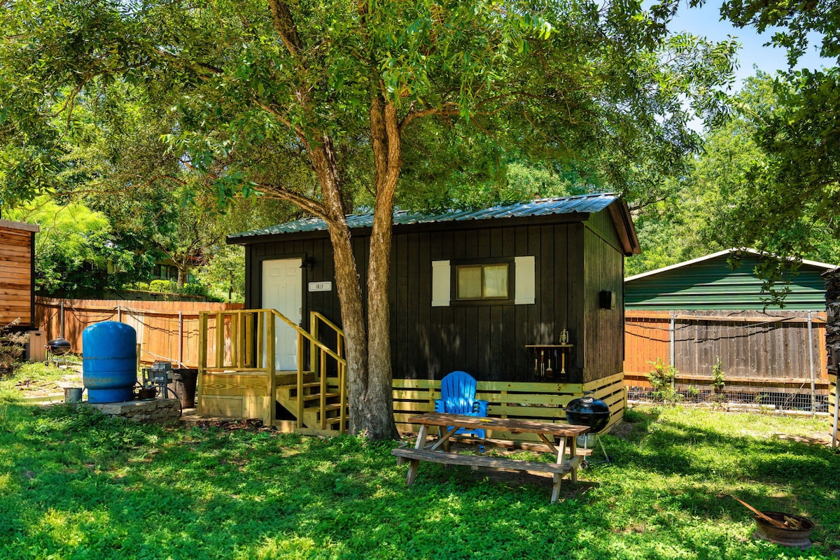 Primitive Cabin at Fernweh Riverfront on the Guadalupe River, Gilly is one of three cabins located on the property with private river access. Appointed with 2 queen size beds, your sleep should be comfortable in the fresh new linens and soft pillows. A communal restroom and showers are a short walk away and shared by the three primitive cabins. Parking Available = 2 Spots