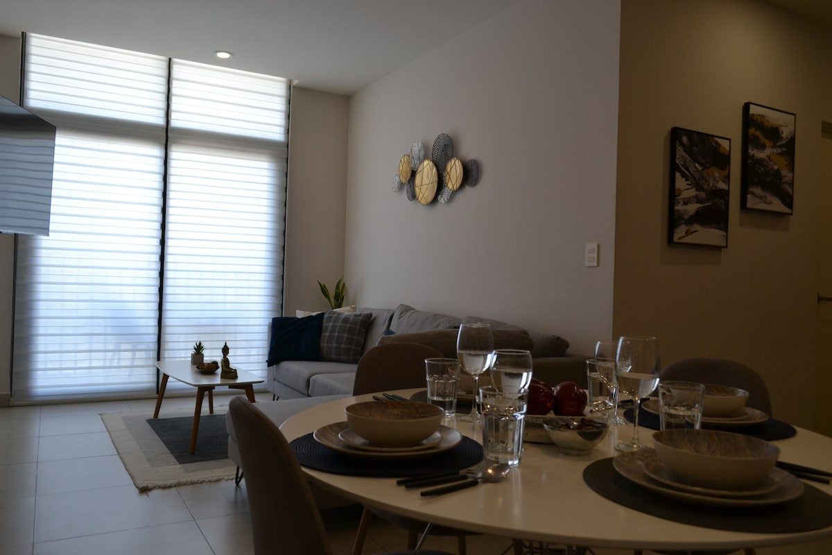 INNHEIMTA - Vatn allan sólarhringinn - 3 manns Verið velkomin til Puntacero! Við hlökkum til að taka á móti þér á einu af okkar lúxus Airbnb í Monterey. Íbúð með einstöku yfirbragði og útsýni yfir Cerro de la Silla. ¡Einstök staðsetning! Þráðlaust net, snjallsjónvarp, loftkæling, 1 bílastæðaskúffa. Tilvalið fyrir stjórnendur, fjölskyldur og ferðamenn. Öryggi 24/7, 3 lyftur, FRÁBÆR ÞÆGINDI. Verslunarmiðstöð með veitingastöðum og OXXO nálægt. King Bed & Double Sofa Bed.
