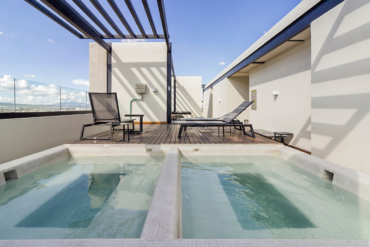 Un refugio exclusivo diseñado para parejas que buscan privacidad, diseño y una experiencia inolvidable en Guanajuato. Disfruta de un jacuzzi privado climatizado con vista panorámica a la ciudad. De día, la luz natural enmarca los colores del centro histórico; por la noche, las luces crean el escenario perfecto para una escapada romántica.