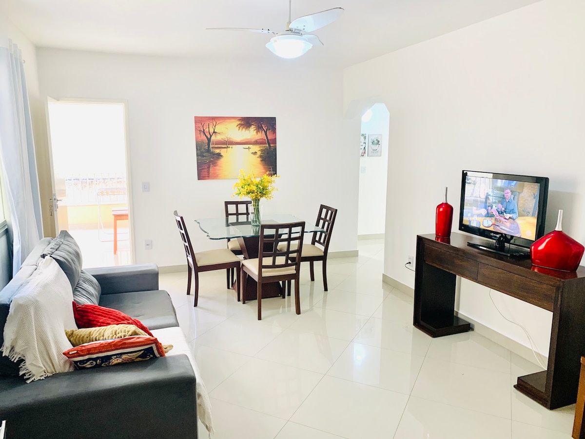 Notaleg íbúð sem er fullkomlega uppsett fyrir þig í miðri Guarapari. 100 m frá ströndinni og enn minna frá húsasundi Hunger. Það er með loftkælingu, þráðlaust net, Netflix, móttökuborð allan sólarhringinn og ókeypis rými (götu) eða bílskúr (greitt). Notaleg íbúð í miðborg Guarapari. 2 mínútna göngufjarlægð er að sandinum og enn minna en það að Beco da Fome - bestu götu Guarapari fyrir skemmtun, mat og bar. Það er loftræsting, þráðlaust net, Netflix og valkvæmt bílastæði í bílskúr.