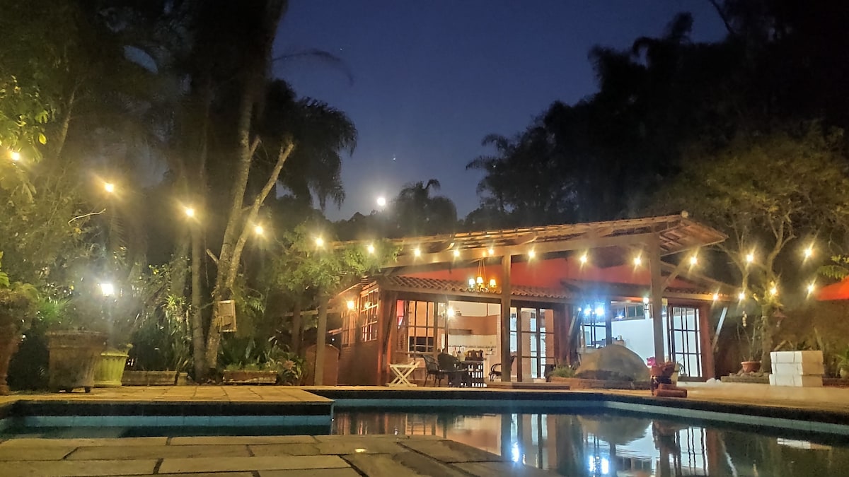 Get back in touch with nature at this architectural gem surrounded by rainforest. The residence features eclectic decor and furniture, wood finishes throughout, a grand piano, and outdoor dining and lounge spaces throughout the property. The property accommodates 12 guests. The price for 8 guests is the price per night that it is established. From 8 guest plus there will be an extra guest fee of 200 reais . The space is very nice to be because the forest is always surrounding scenery. A vegetable garden and cozy environments are throughout the property full of charm. O espaço é muito agradável de estar, pois a mata esta sempre rodeando os cenários. Uma horta e ambientes acolhedores estão em toda a propriedade cheia de charme. E perfeito para uma viagem em família. Há uma piscina aquecida. Toda a casa e seus Chales assim como a piscina aquecida são de uso exclusivo dos hóspedes. Uma trilha poder ser percorrida a pé em meio à mata Atlântica. Tenho caseiros na propriedade para que tenham uma estadia mais confortável. Cozinham e arrumam a casa a um custo de 300,00 reais ao dia The home is located close to the historic center of Embu das Artes. The town is home to artisan shops, restaurants, and a vibrant arts and crafts community. Não há transporte público perto Melhor ir com condução particular, táxi ou Uber Ha caseiros na casa que tomam conta da propriedade e dos hóspedes. Custo dos serviços e de 300,00 reais ao fia para arrumação e cozinha.