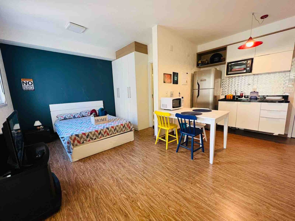 Glæsilegt stúdíó, GLÆNÝ, staðsett á einu besta svæði Guarulhos og 9 km frá flugvellinum. Umkringdur bestu börum og veitingastöðum á svæðinu og 200 metra frá Mayan Forest. Hér færðu bestu upplifunina fyrir dvöl þína.