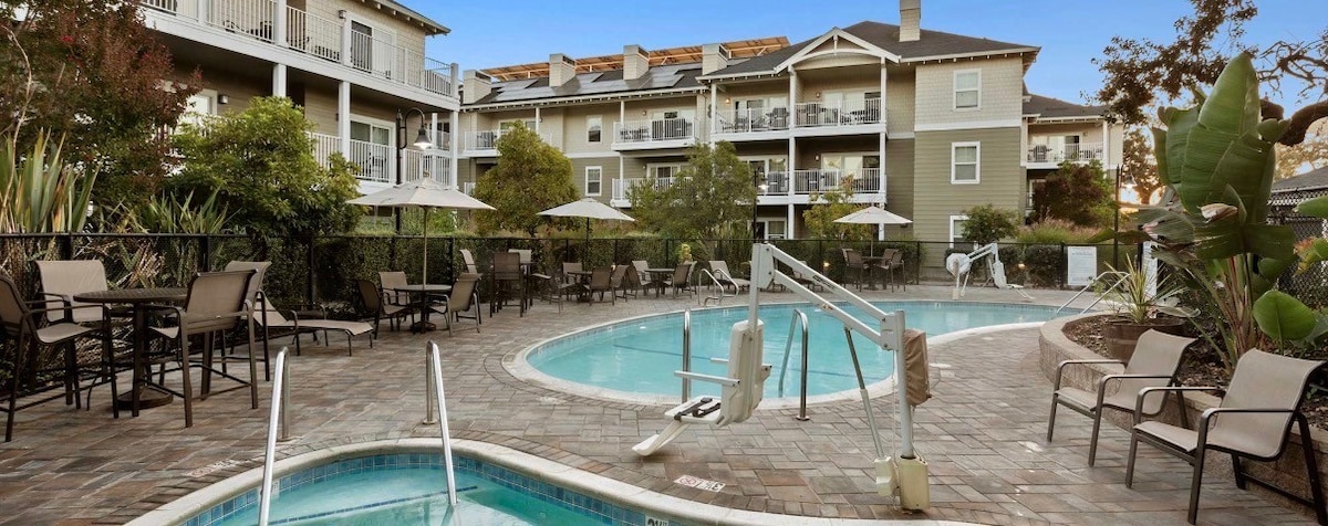 „Eign Allen var frábær. Mjög nálægt sögulegum miðbæ Santa Rosa en mjög rólegt.“ Í eigninni eru tvær dásamlegar gestasvítur sem hver um sig er með eigið sjónvarp, setusvæði og útidyr. Gestir eru með mjög stórt baðherbergi og eldhús. Í bakgarðinum er mjög hreint og nothæft rými til að slaka á og borða. Heimilið býður upp á bílastæði við götuna. Hverfið er staðsett miðsvæðis í aðeins 5 mínútna göngufjarlægð frá Railroad Square. Lykillaust aðgengi Íbúð á fyrstu hæð Örugg inni í hjólageymslu