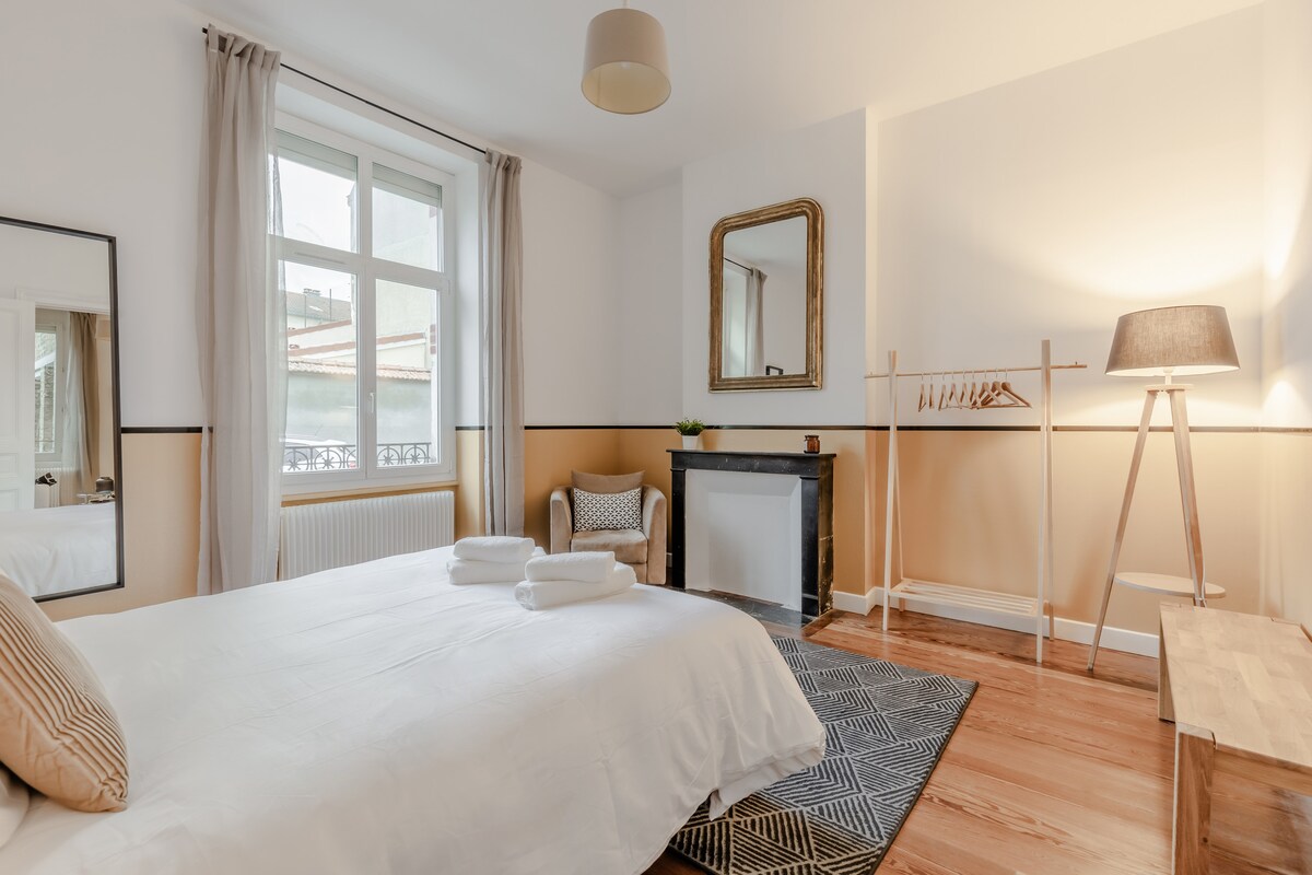 Uppgötvaðu þessa fallegu 50m2 íbúð „le Clos Grandval“ sem er hönnuð sem hótelíbúð og nýtur fallegrar 10m2 einkaverandar sem er staðsett í innan við 15 mínútna göngufjarlægð frá dómkirkjunni í Reims og hinum virtu kampavínshúsum (Taittinger, Pommery, Mumm..). Íbúðin, sem er algjörlega endurnýjuð, býður upp á öll þægindi sem þú þarft, þar á meðal fyrir fjölskyldur sem ferðast með barn eða barn. Upplifðu einstaka og ósvikna upplifun í miðri borginni Sacres!