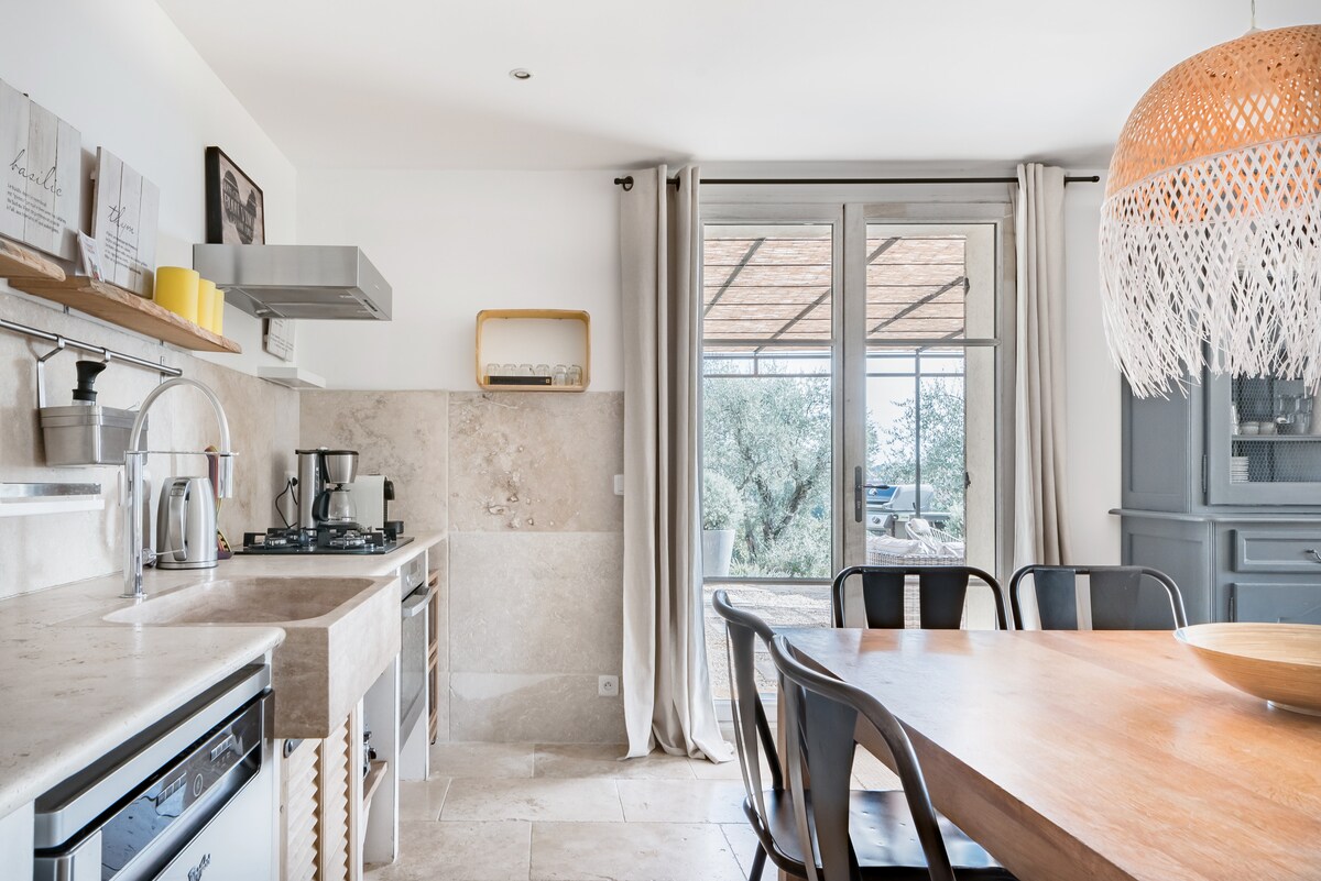 Découvrez ce gîte 100 % nature et sa terrasse propice au farniente sous les oliviers. Dans une palette de tons doux de paille et de calcaire, la bastide dévoile une harmonie de matériaux écologiques et objets artisanaux aux couleurs de la Provence. Vous pourrez accéder librement à la piscine du domaine (partagée avec le deuxième gîte du domaine, La Chapelle) Sejour cuisine ouverte équipée 4 chambres avec salles de douche et wc ( +1 wc indépendant rdc) literie ,couettes et oreillers écologiques, linge de lit biologique Terrasse panoramique privative Accès piscine du Domaine Il s'agit d'une partie de la Bastide avec accès indépendant. La deuxième partie de la Bastide est occupée par les proprietaires mais orientée de l'autre coté. Une chapelle ancienne transformée en gîte fait également partie du Domaine. Accès à la piscine du domaine (Partagée avec le deuxième gîte du domaine) Un domaine de 6 hectares complanté de plus de 3OO oliviers centenaires que vous pourrez découvrir avec de bonnes chaussures. Un projet écologique basé sur 5 axes principaux : 1/Protection du patrimoine existant 2/Utilisation de matériaux sains et naturels 3/Limitation des énergies 4/Gestion de l'eau 5/Gestion des déchets À 1,5 km du centre-ville de Grasse, séjournez dans un havre de paix typiquement provençal, au milieu des oliviers et profitez d'une vue imprenable sur les collines. Aéroport de Nice Cote d'Azur à 35 minutes. Gare de Cannes à 20 minutes. Quartier St François accessible en voiture du centre de ville de Grasse, en bus (Ligne 9 Jeanne Jugan) ou même à pieds ( 30 minutes avec dénivelés) La maison des propriétaires est encore en travaux mais ne génère aucune nuisance.