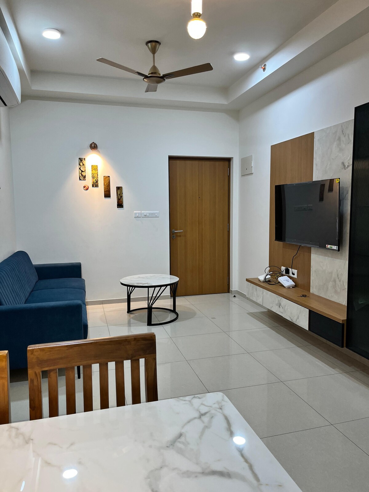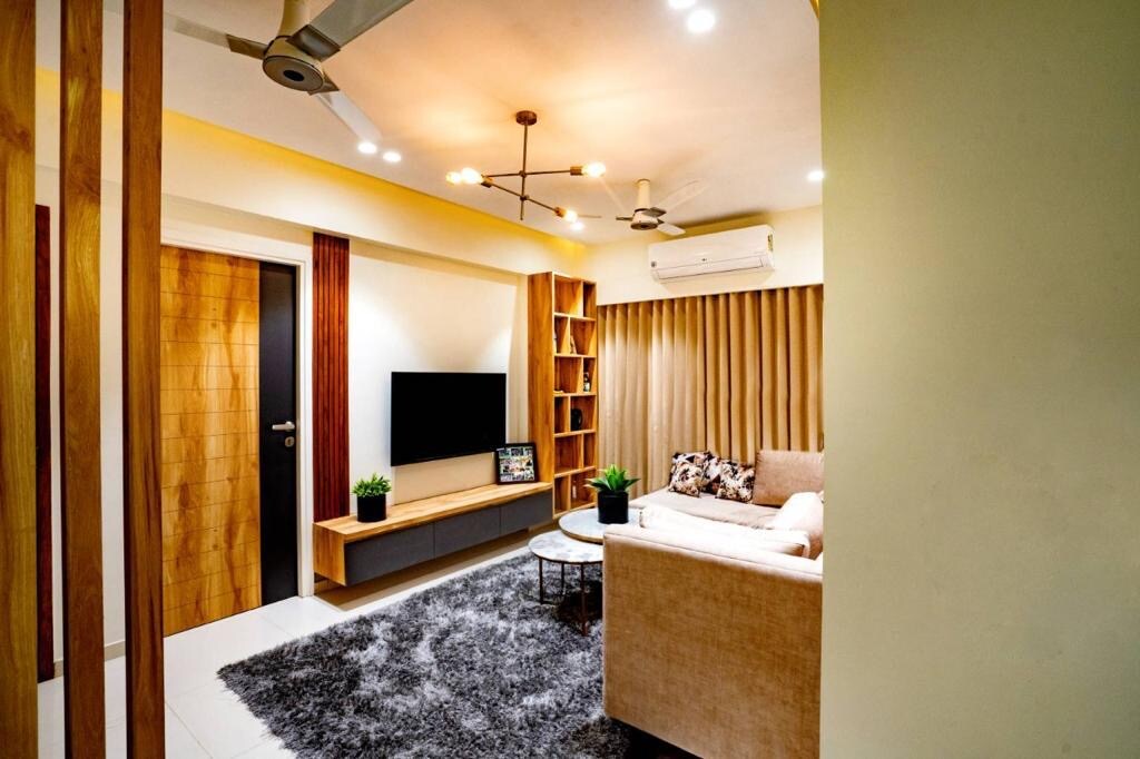 Þessi töfrandi tveggja svefnherbergja og tveggja baðherbergja íbúð er staðsett á efri hæð í hágæðaíbúðarblokk í hinni virtu GIFT-borg í Gandhinagar og er fullkomin blanda af nútímalegri fágun og þægindum. Þessi Airbnb-gersemi er tilvalin fyrir vinnuferðamenn, fjölskyldur eða hópa sem leita að friðsælli afdrep. Hún býður upp á rúmgóða stofu, víðáttumikið útsýni og úrval af þægindum í hjarta fjármála- og tæknigeirans á Indlandi. Aðeins 200 metra frá Mumbai - Delhi NH48