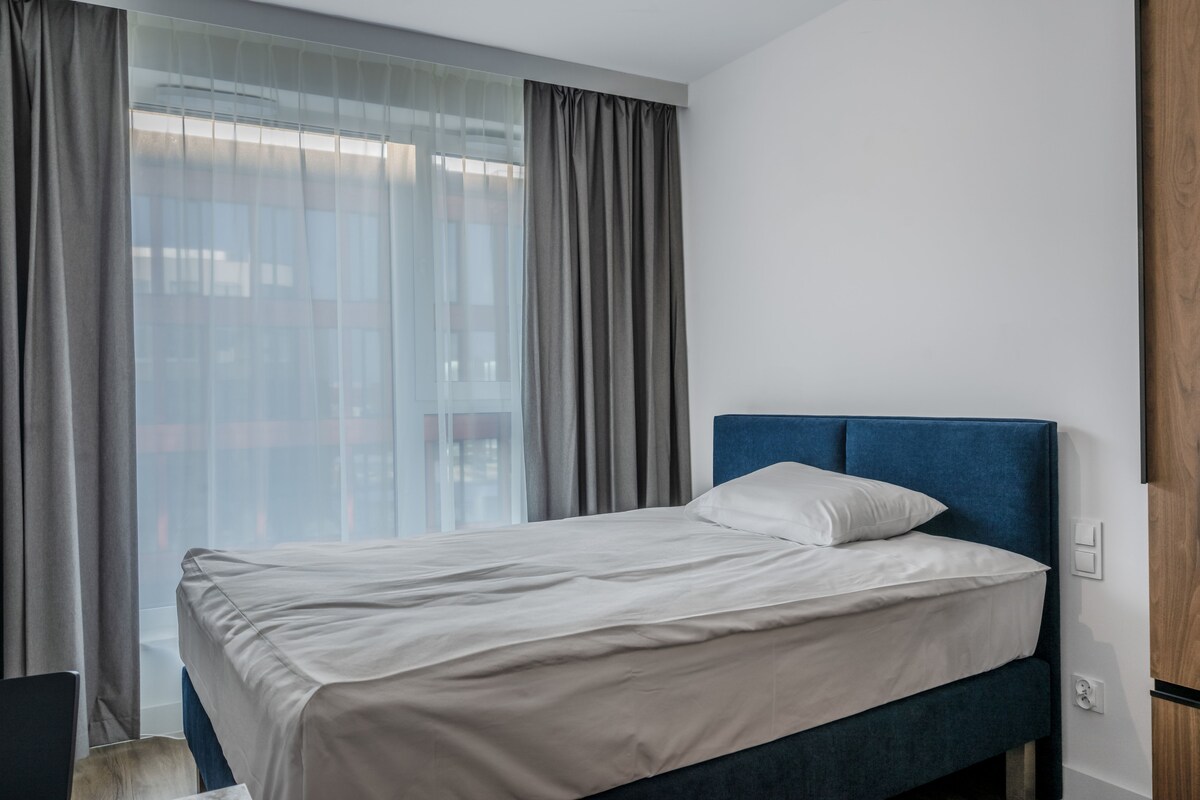 Apartament Studio City View to komfortowy i funkcjonalny pokój typu studio z przepięknym widokiem na panoramę Gdańskiego Starego Miasta. Wyjątkowy komfort i przyjemny wystrój pozostawią po sobie niezapomniane wrażenia.