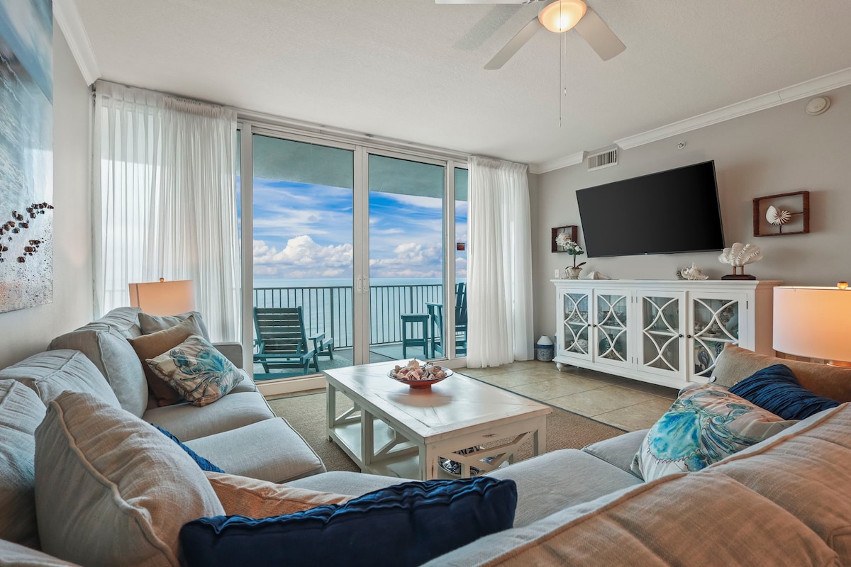 Njóttu glæsilegs útsýnis yfir ströndina þegar þú stígur inn á 14. hæð Lighthouse íbúðina okkar og farðu strax inn í orlofsstillingu. Byrjaðu að slaka á og slappa af með fjölskyldu eða vinum í íbúðinni okkar við ströndina með 3 snjallsjónvörpum, stórum svölum, nýjum tækjum, leikjum, þráðlausu neti og strandlegum innréttingum. Taktu eina af fimm lyftum niður í göngutúr á sykursandströndinni við sólsetur til Sea N Suds eða The Hangout og njóttu ávaxtanna sem fylgja því að vera á besta stað í öllum Gulf Shores. Bókaðu í dag!