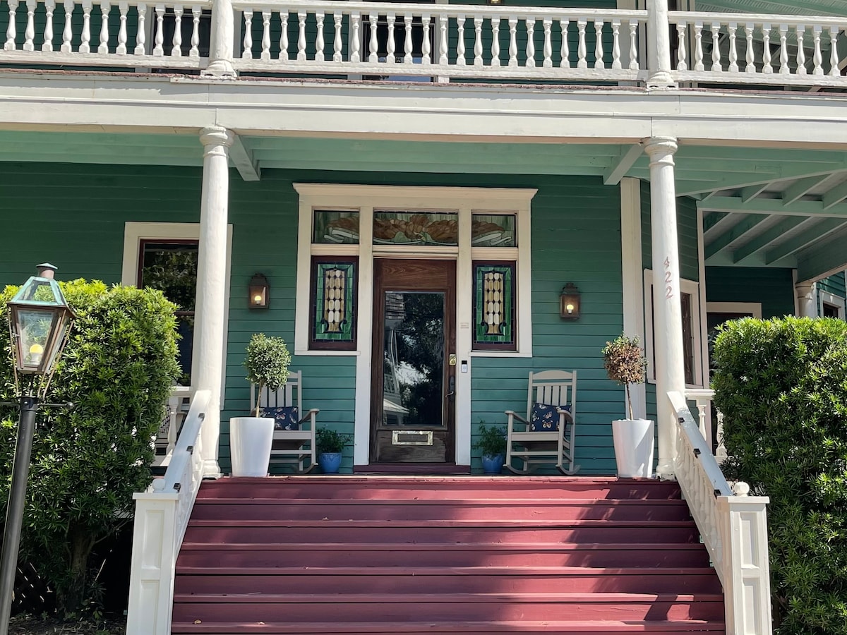 Ferðastu aftur til fortíðar með herrum þínum og dömum á þessu frábæra sögufræga heimili! Vín og matur fyrir gesti þína í gamaldags stíl í hjarta hins sögulega miðbæjar Pensacola aðeins einni húsaröð frá Palafox St. Þetta fallega, sögulega heimili í Pensacola státar af mörgum upprunalegum eiginleikum eins og svífandi 11 feta loftum, risastórum gluggum úr lituðu gleri og glæsilegum, glæsilegum viðarstiga. Fullkomið pláss fyrir smekklega Bachelor- eða Bachelorette-helgi! Gakktu að Palafox-markaðnum og miðbænum!