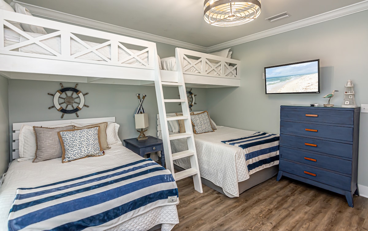 „Shipwrecked Orange Beach“ ☀ Átta reiðhjól í boði ☀ Borðtennis og fótbolti ☀ 4 Arcades w/ Star Wars Pinball & Wheel of Fortune, NBA Jam og Pacman ☀ Strönd – 5 mín ganga (kerra, stólar og leikföng fylgja) ☀ Sundlaug – 1 mín. ganga út um útidyr ☀ Beint aðgengi að göngu-/skokk-/hjólastígum Gulf State Park – 1 mín. ganga ☀ Hleðslutæki fyrir rafbíl + ókeypis bílastæði fyrir 3 ökutæki ☀ Stafrænt borðspilaborð ☀ Sér, afgirtur sand bakgarður með hangandi stólum + maísgat + hengirúm + eldstæði + grill ☀ Barnahlið
