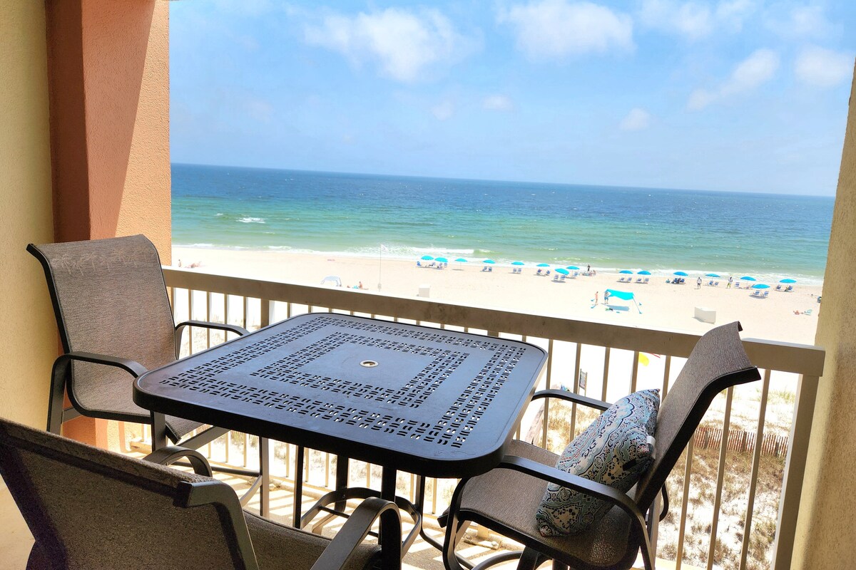 Wake up to the Gulf right outside your window. This comfortable, updated oceanfront condo has breathtaking balcony views, TempurPedic beds, & everything needed for a relaxing beach escape. What guests love most: • Direct beachfront location with private balcony • TempurPedic mattresses • Heated pool & sauna • Beach wagon, chairs, umbrellas included • Fully equipped kitchen & bathrooms Close to local faves like The Wharf, Gulf State Park, The Hangout, Flora-Bama, & Adventure Island.