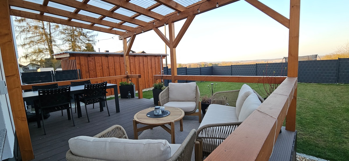 LuxApart Vista er lúxus orlofsheimili þitt í Eifel með víðáttumikilli útisaunu – fullkomið fyrir pör, fjölskyldur og vini. Njóttu 135 fermetra þæginda með mögnuðu útsýni yfir Eifel-skógana. Tvö friðsæl svefnherbergi, nútímalegt eldhús með eyju og aðgangi að 70 m2 verönd ásamt notalegri stofu með snjallsjónvarpi og arni. Slakaðu á í gufubaðinu utandyra og upplifðu fullkomið frí, hvort sem það er rómantískt sem par, með fjölskyldu eða vinum.