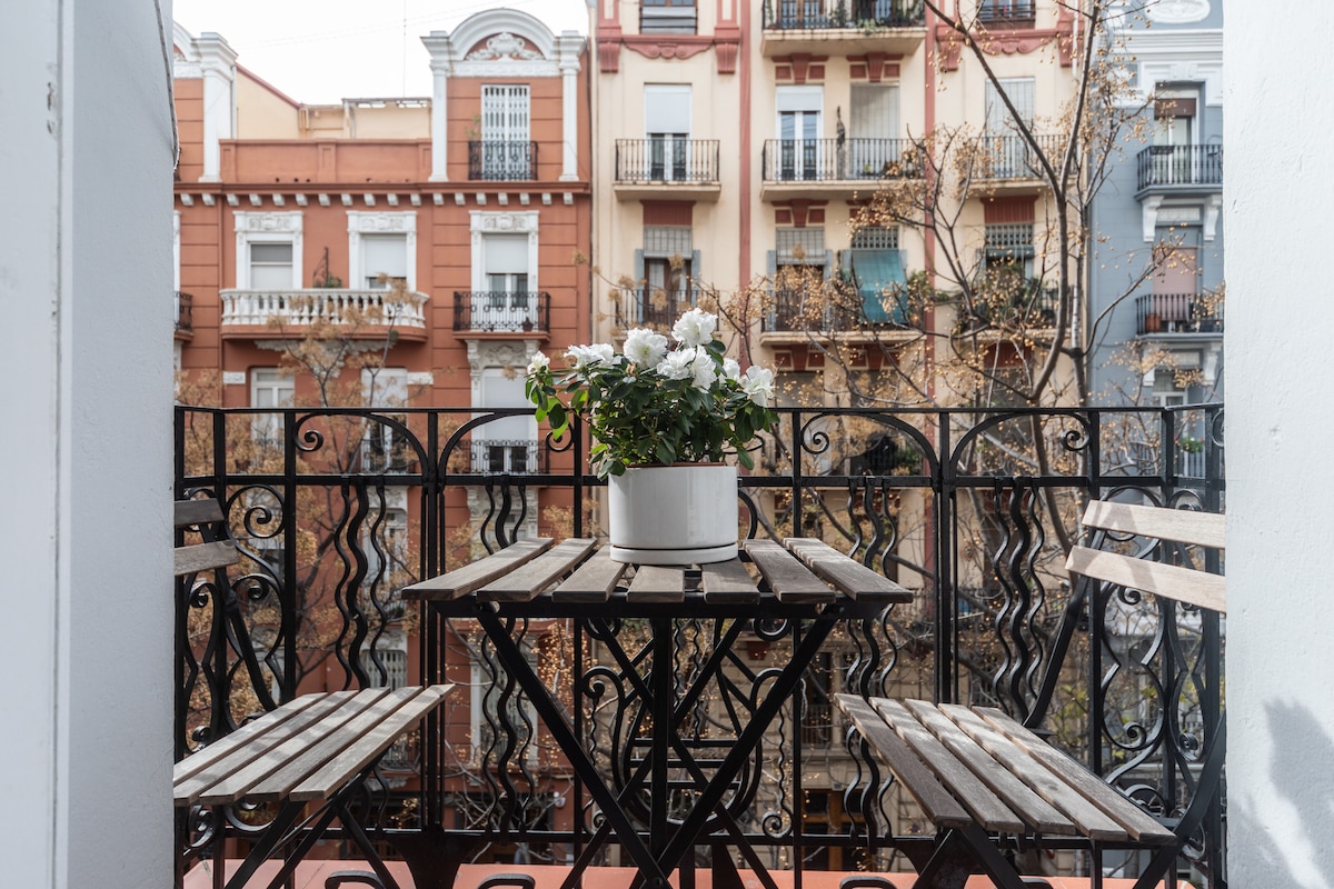 Stylish 56 m2 studio with a queen bed and a 25 m2 patio, perfect for one person, two friends or a couple. Located in a quiet yet central area. A 10 min walk to Russafa where you will find all the funky cafes, shops and bars. A 2 min walk to Turia Gardens where you can admire the futuristic City of Arts & Sciences buildings and walk or cycle the 9 kms of green space that wraps around the old city. About 20 min walk to the old town. Easy bus connection to the beach.