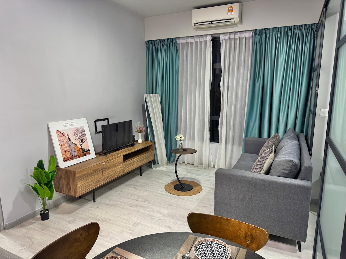 Við erum staðsett í 15 mínútna fjarlægð frá Kota Kinabalu-flugvellinum og í 20 mínútna fjarlægð frá miðborg Kota Kinabalu Það eru mörg þægindi í verslunarmiðstöðinni hér að neðan eins og verslanir, veitingastaðir og skemmtistaðir HREIÐRIÐ Stofa : Snjallsjónvarp með þráðlausu neti, svefnsófa og mjúkri lýsingu til að njóta rómantískrar dvalar eða notalegrar dvalar Eldhús : spaneldavél, lítill ísskápur, ketill, loftsteiking, diskar, skál, bollar og eldunaráhöld