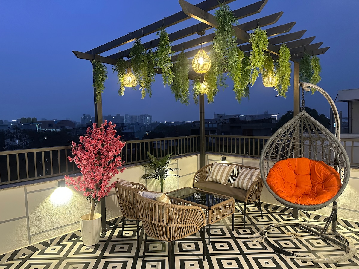 Þessi risíbúð er staðsett innan um iðandi golfvallarveginn en býður þó upp á kyrrlátt útsýni yfir Aravali-skógarsvæðið. Stígðu inn á rúmgott heimili okkar með stofu, notalegri borðstofu og aðliggjandi eldhúsi. Svefnherbergi bjóða upp á sveitalegan sjarma, þægileg rúm, næga geymslu og aðgang að friðsælum veröndum. Stakt baðherbergi er fullbúið. Njóttu útsýnis frá tveimur stórum veröndum, einni af borginni og hinni yfir hinn friðsæla Aravali-skóg með verönd.