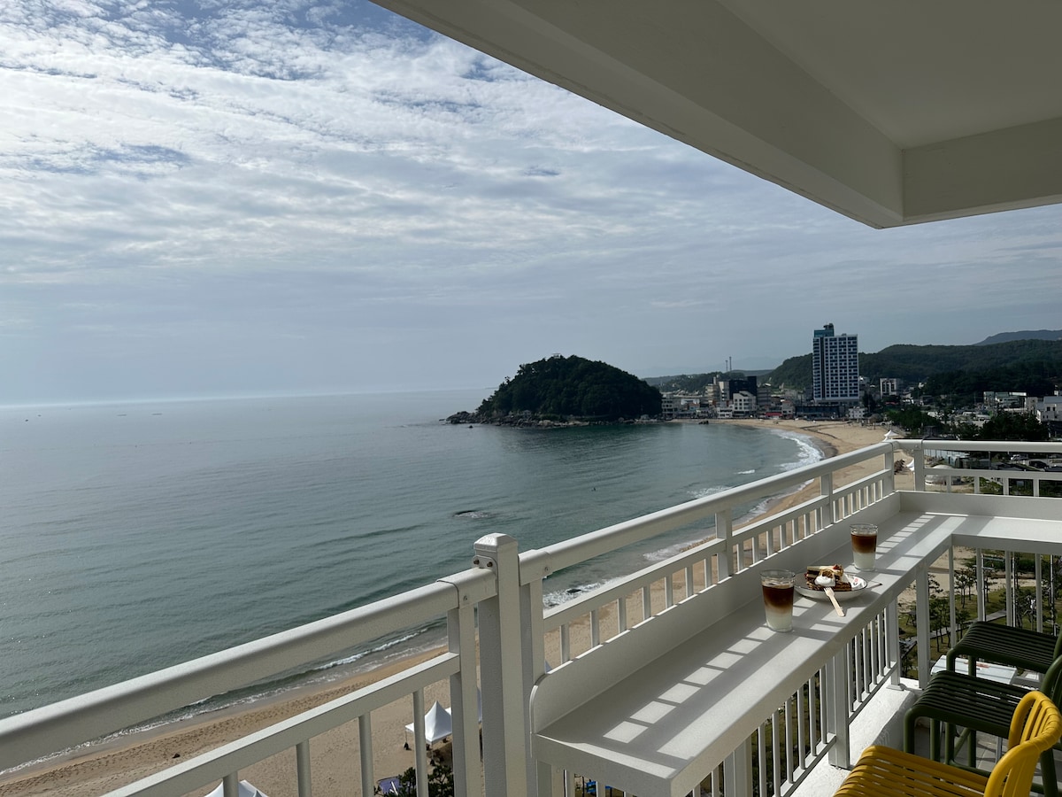 🥭Þetta er Mangone. Öll herbergin eru einu fjögurra manna breiðu herbergin Veröndin bar verður besta sjávarútsýni🏖️ og besti te🧋 staðurinn fyrir þig. Það er strönd í 10 sekúndur fyrir framan anddyri byggingarinnar og það🏝️ er matvöruverslun á tveimur stöðum við hliðina á byggingunni. Það 🛏️er tveggja herbergja og fyrsta herbergi (king bed) annað herbergi (queen bed) rúmgott rúm veitir þægilegan svefn.💟 Í stofunni er borðstofuborð fyrir 4 manns🍽️. Te tími og snarl, vín, viskí o.s.frv. Í boði (vín. Viskí. Soju gleraugun) eru öll tilbúin. Eldunaráhöld eru tilbúin. Það sem er ekki hægt Grillun kjöts (hrátt kjöt). Lyktin af krydduðum fiski, gufusoðnum krabba o.s.frv. hverfur ekki. Athugaðu að það er ekki hægt fyrir gesti. Allt herbergið er með sjávarútsýni og þú getur notið útsýnisins yfir hafið frá🌊 stofuglugganum við borðstofuborðið ~ Sólarupprásina er vel þegið í🌅 fyrstu stofunni á veröndinni í herberginu. Sjáumst fljótlega🙏🏻