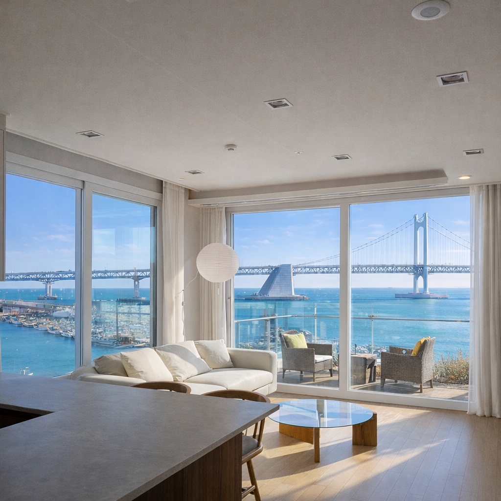 # Full Ocean View # New # 2 Bedrooms + Living Room, 3 Beds # Full View of Gwangan Bridge # Free Parking # 20 Pyeong # Best Cleanliness # Mimem