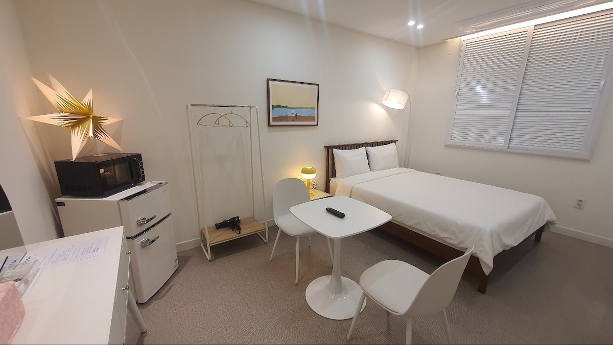 Við kynnum💕 nýuppgerða „Mind No. 2“. Þetta er nýuppgert hús sem er reiknað út fyrir fullkomið frí frá gestunum sem koma heim til okkar til að fá fullkomið frí. Það er í 10 mínútna göngufjarlægð frá Gangneung-stöðinni, 15 sekúndum frá Gangneung Restaurant Umzine Pajang Wagon Main Store, 30 sekúndna matvöruverslun, og það er á fyrstu hæð í einbýlishúsi. ▪! Hámarksfjöldi gesta: 3 manns (þarf að spyrjast fyrir um fleira fólk) ▪Parking Parking: Ókeypis bílastæði í boði í garðinum ▪? Uppbygging: 2 herbergi (1 rúm hvert), eldhús, stofa, baðherbergi Vegna hávaðans er það fyrir þrjá einstaklinga svo að ef þú getur farið varlega með fjölskyldu þína eða hávaða eru 4 manns einnig til taks. Vinsamlegast skildu eftir textaskilaboð áður en þú gengur frá bókun. Reykingar eru ekki leyfðar í eigninni og ekki er hægt að bóka gistingu fyrir líflega samkomu með hávaða eftir kl. 21:00. Vinsamlegast lestu húsreglurnar „fyrst“ áður en þú bókar.