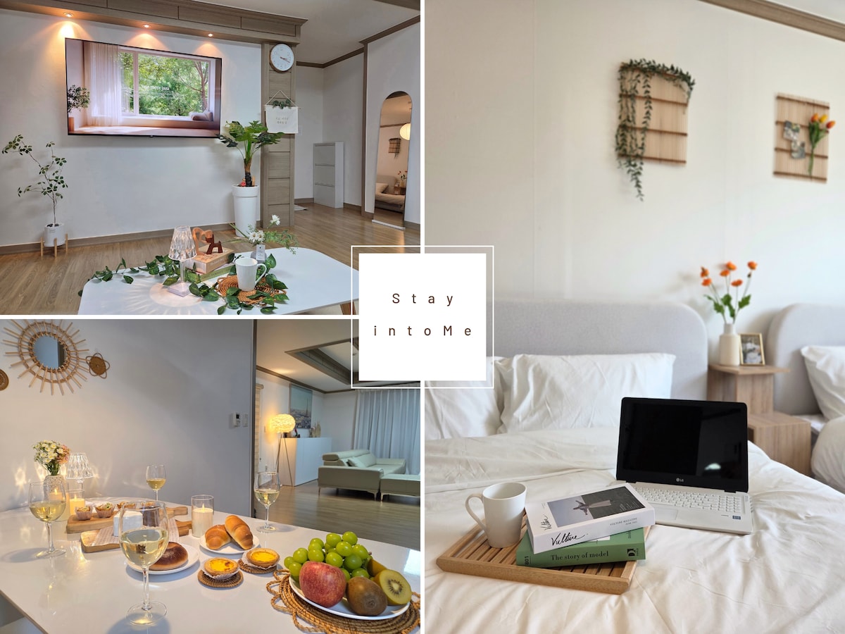 스테이 인투미( Stay Intome)는 '내 안에(into me) 머물다(Stay)'라는 의미입니다. 일상에서 벗어나 오롯이 '나'에게 집중하는 시간을 제공하고 싶다는 마음을 담아 인테리어하였습니다. 그리고 미니멀라이프를 지향하는 호스트의 취향이 담겨 있어 간결하면서도 따스함을 느낄 수 있습니다. 이곳에서 소중한 사람들과의 힐링, 쉼 그리고 그 이상의 의미를 찾는 시간을 만들기 바랍니다. 우리 숙소는 전주시 금암동에 있는 40평대 다가구 주택으로, 전주 터미널 및 전주역과 가까워 교통이 편리하고 관광지(한옥마을,덕진공원,동물원,객리단길 등)와도 접근성이 좋습니다.