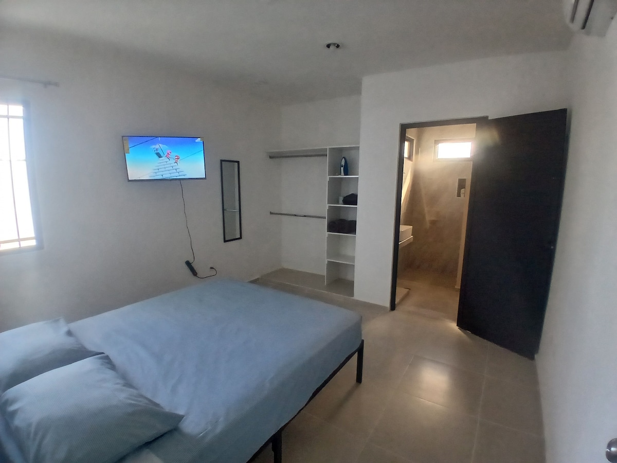 Departamento limpio, lugar tranquilo para dos huéspedes. Cuenta con TV, cocineta, minibar, microondas, olla eléctrica, cafetera, vajilla, vasos. Cómoda y amplia terraza compartida. A tan solo 20 minutos en camión a la Avenida Principal Paseo de Montejo, el camión pasa a 8 metros del departamento. También tiene cerca tienda de vivieres básicos OXXO a 5 minutos caminando y a 10 minutos caminando del super Soriana y a 15 minutos en camión la plaza comercial Altabrisa.